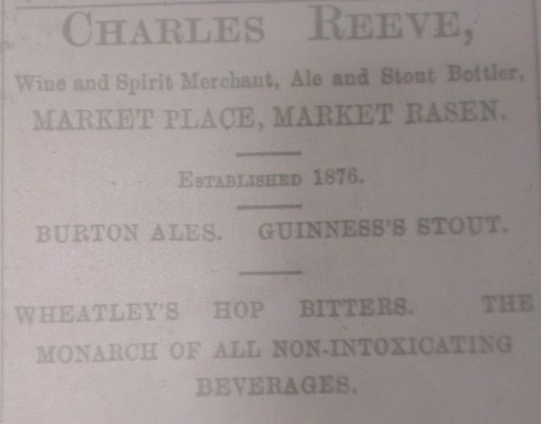 1/2 pint bottle from Charles Reeve of Market Rasen. Reeve born in Harmston in 1854, was a Wine, Spirit & Beer Merchant in Rasen from 1876 residing at 23 Market Place, until 1900 when he became bankrupt and Fred Mumby took over the premises continuing a similar business. Advert from the Market Rasen Mail 1895.